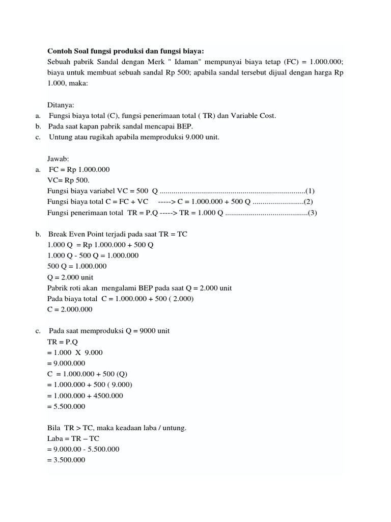 Koleksi contoh soal biaya produksi + jawaban. Contoh soal dan jawaban akuntansi keuangan lanjutan 2 konsolidasi dapatkan contoh. Latihan soal akuntansi biaya ini sangat baik untuk persiapan menghadapi tes dan ujian semester, tengah semester, ujian pendadaran komprehensif. Biaya tetap fixed cost adalah biaya yang tidak berubah seiring perubahan tingkat aktivitas produksi pada periode tertentu. Contoh soal menghitung biaya tetap dan biaya variabel.
